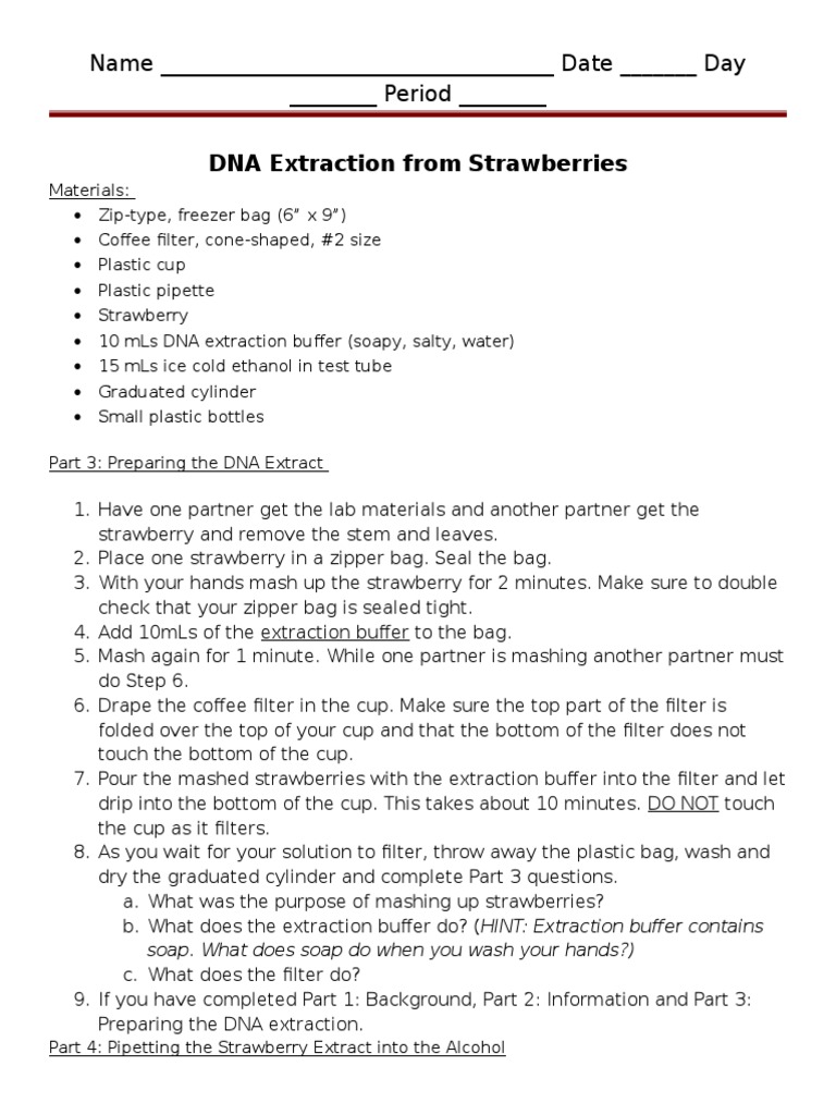 She walks through the steps and explains the purposes for each step in the procedure.follow me on. To precipitate dna from solution. Strawberry dna extraction worksheet nidecmege. Strawberry dna extraction all eukaryotic cells have a nuclear membrane that encircles the nucleus as well as a cell membrane that encases the entire cell. Introduction the structure of dna is made of nitrogenous bases materials zip lock bag strawberry cheesecloth funnel 100 ml beaker test tube wooden coffee stirrer dna extraction buffer alcohol procedure.